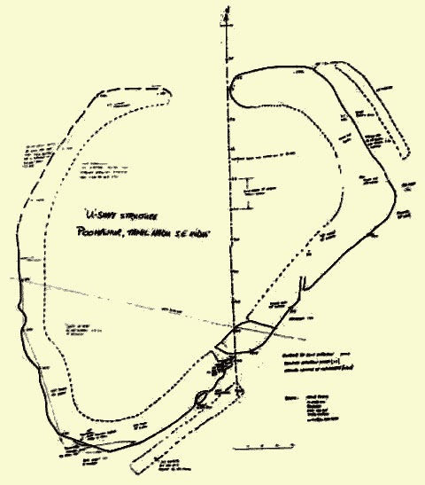 அதன் மொத்த நீளம் 85 மீட்டர். 'U' அமைப்பின் கை போன்ற இரு அமைப்புகளின் இடையே உள்ள தூரம் 13 மீட்டர். இந்த அமைப்பின் உயரம் 2 மீட்டர். கை போன்ற அமைப்புப் பகுதி துண்டு துண்டான கற்களால் ஆனது போல இருக்கிறது. இயற்கையில் இந்தஅமைப்பு தானாகவே இருக்க முடியாது. இதை ஆராய்ச்சி செய்தவர்கள் இப்படி வரைபடமாகக் காட்டியுள்ளார்கள்.