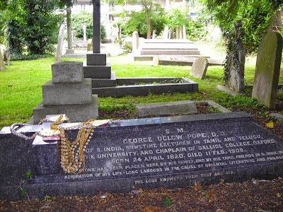 "George Uglow Pope D.D. of South India sometime lecturer in Tamil and Telugu in the University and chaplain of Balliol College, Oxford, born 24th April 1820. Died 11th February 1908. This stone has been placed here by his family and by his Tamil friends in South India in loving admiration of his life long labours in the cause of oriental literature and philosophy"